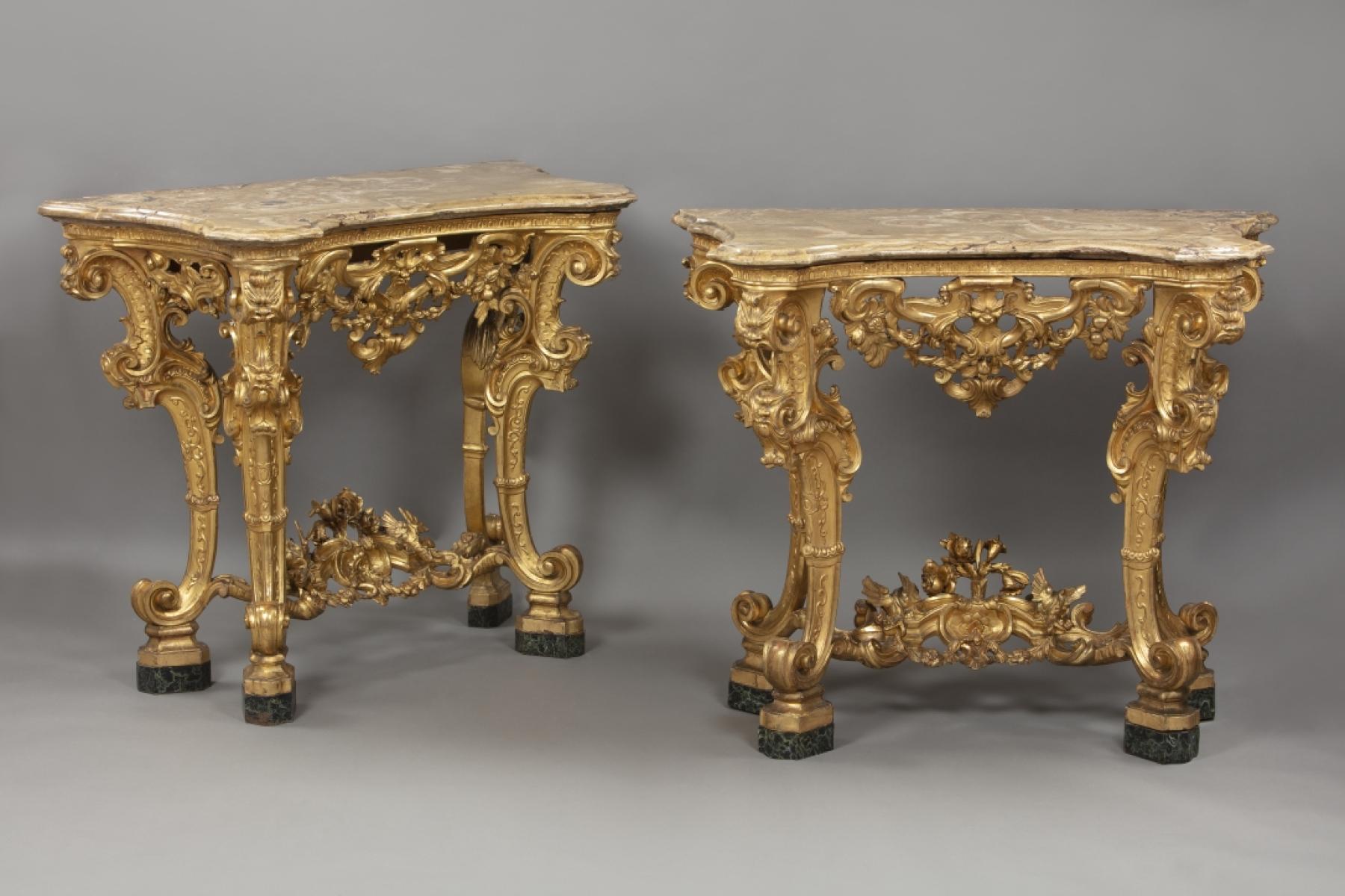 Pierced bands decorated with floral festoons, double volute legs adorned with masks and marble tops on a strongly shaped structure.