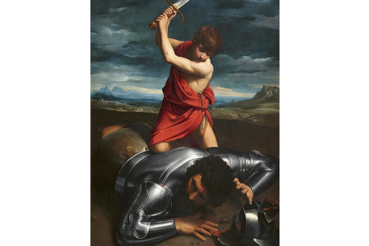 L’avvio della rassegna si colloca a metà tra le due impostazioni, rivelandosi al contempo biografico e sentimentale. In apertura sta – come un magnifico esergo – il tondo allegorico del Louvre con il fraterno abbraccio tra Il Disegno e il Colore (o Il Disegno e la Pittura); un dipinto del Reni maturo, sul 1625 circa, di una materia fattasi argentea, limpidissima, quasi soffiata sulla tela. Un avvio che anticipa al visitatore più esperto un finale che vedrà sciogliersi quell’abbraccio. Recuperando immediatamente le fila della narrazione lineare, Cueto riporta lo spettatore sulle tracce dell’apprendistato bolognese del pittore, tra la prima lezione del fiammingo Denys Calvaert, l’alunnato presso Ludovico Carracci e la fascinazione per la pittura di Veronese, affettuosamente ricordato come il suo «Paolino», filtrato dalle esperienze venete di Annibale Carracci. Tra Bologna e il trasferimento a Roma, cioè attorno al 1600-1601, l’esposizione del Prado non argomenta soltanto l’ineludibile rapporto con Raffaello e l’archeologia classica ma, con efficacia, sviluppa una riflessione sul rapporto con il contemporaneo Caravaggio. Pur non brigandosi di conciliare l’inconciliabile — il bolognese pittore dell’incanto, il lombardo del disincanto — la mostra propone un confronto che chiarisce il modo peculiare in cui Reni guarda il suo principale rivale sulla scena romana. Al Davide e Golia di Caravaggio (Prado) è affiancata una tela di medesimo soggetto, un dipinto poco noto ma eccellente di Reni intorno al 1606, oggi nelle collezioni del Museo Banhof Rolandsek di Remagen. Un manifesto figurativo, quello del bolognese, che dichiara con piena evidenza un interesse per Caravaggio che il pittore tenta, come avrebbe fatto con la Natura, di mediare e correggere. Il «troppo naturale» del Merisi diviene per Reni l’occasione di ricalibrare la composizione, stemperando la sensualità della posa dell’eroe biblico di Caravaggio e spostando la scena nel punto di equilibrio che precede il fendente mortale diretto al collo di Golia. Al violento chiaroscuro del lombardo, che concentra l’attenzione sulla truculenta disarticolazione della testa dello sconfitto, Reni sostituisce un paesaggio plumbeo, crepuscolare, intriso di ricordi squisitamente emiliani; il dipinto di Guido si sarebbe perfettamente confrontato con il Davide e Golia di Orazio Gentileschi (National Gallery of Ireland), caravaggesco infedele ed elegante, che similmente al pittore bolognese fornisce sovente letture rasserenate delle invenzioni del maestro lombardo.