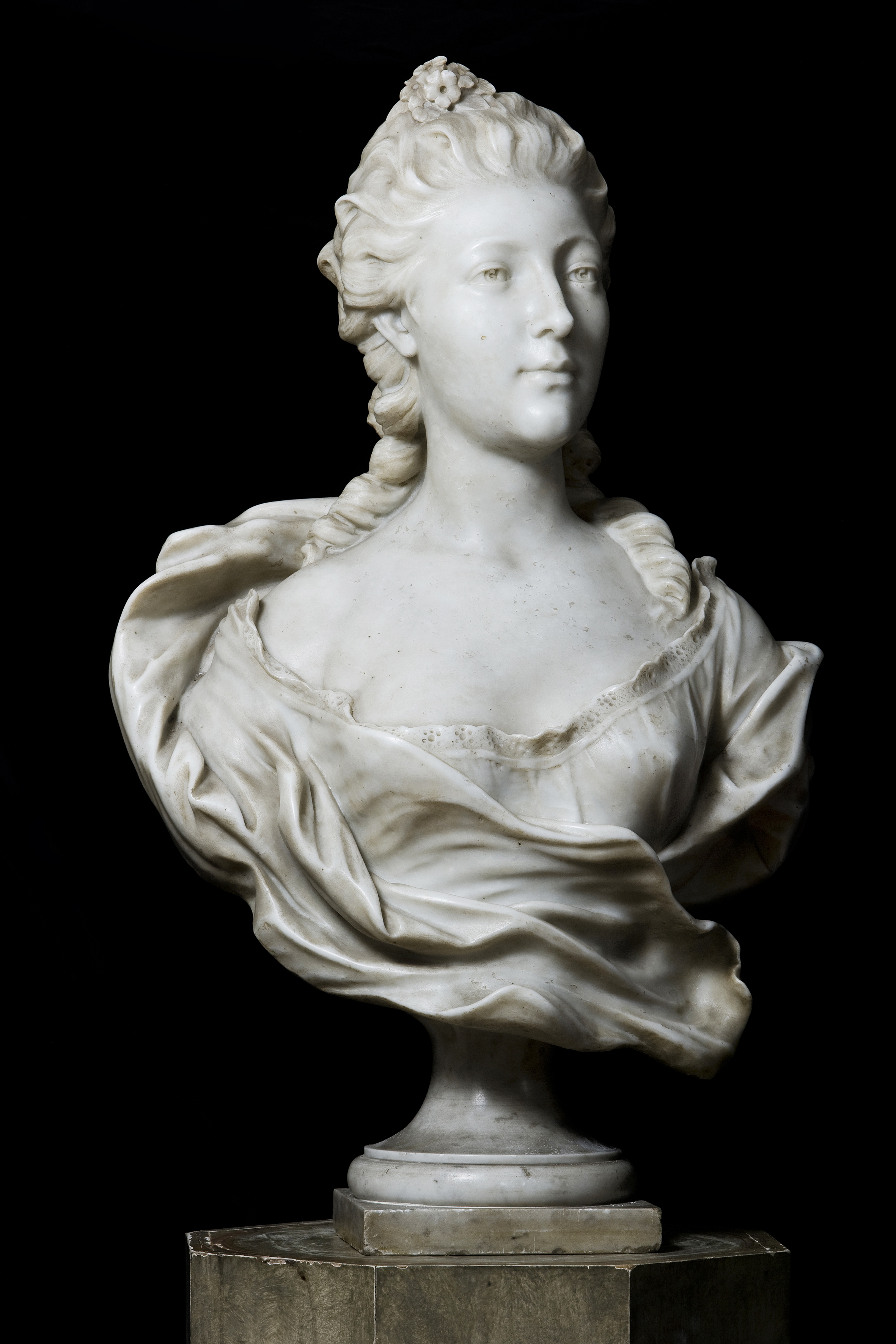 The sculpture depicts the bust of Madame du Barry, a celebrated figure of the French court in the 18th century. Madame du Barry’s face appears serene and slightly detached, with a forward gaze that conveys dignity and grace. Her features are soft and smooth, her skin rendered with great mastery, while her elaborately styled hair reflects the fashion of the time. The drapery of the bust, sculpted with remarkable skill, suggests the movement of fabric and contributes to an effect of natural elegance. Madame du Barry (Jeanne Bécu, 1743–1793) was the last mistress of King Louis XV of France, succeeding Madame de Pompadour as the central figure in the monarch’s private life. Her influence at the court of Versailles was significant: she became a symbol of the luxury and elegance of Louis XV’s later reign, but also an emblem of the social and moral tensions that preceded the French Revolution.