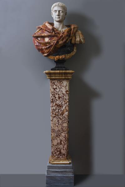 Coppia di ovali in marmo del Grand Tour, con rilievi degli Imperatori Romani Vespasiano e Domiziano in marmo Giallo Antico su fondo in marmo Rosso Antico con iscrizione T VESP. AUG e DOMIT. AUG, in cornici modellate in bronzo con anelli di sospensione.